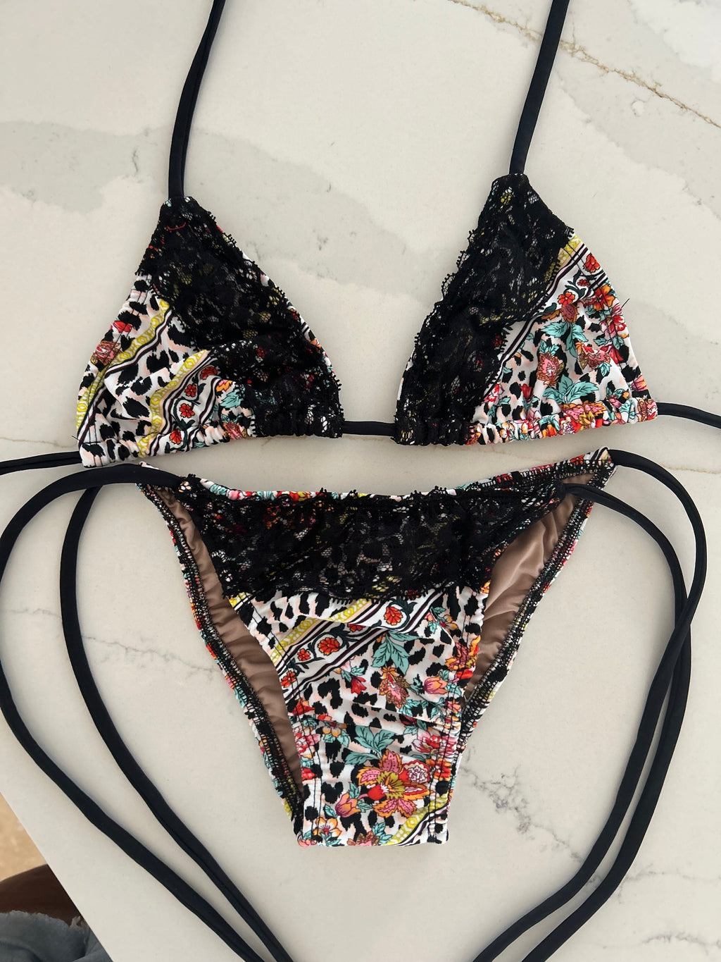 Black Lace Animal Print Spaghetti Bikini Bottom